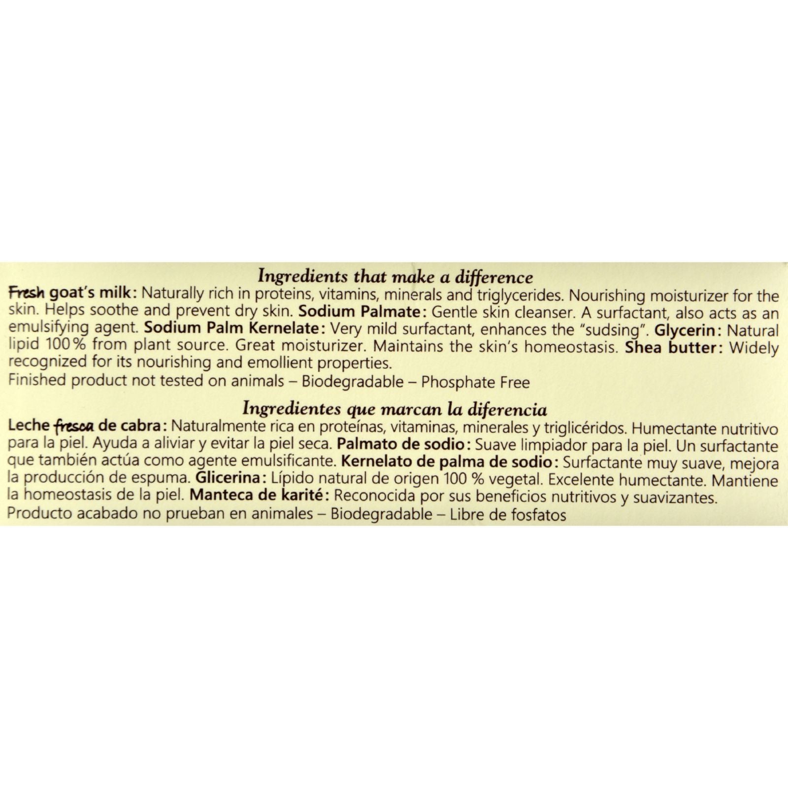 - Ingredients: SODIUM PALMATE;SODIUM PALM KERNELATE;WATER;GOAT MILK;GLYCERIN;FRAGRANCE;BUTYROSPERMUM PARKII;SHEA;BUTTER;SODIUM CHLORIDE;SODIUM GLUCONATE;TITANIUM DIOXIDE;TETRASODIUM GLUTAMATE DIACETATE;CITRIC ACID;SODIUM HYDROXIDE;AMYL CINNAMAL;BENZYL SALICYLATE;BUTYLPHENYL METHYLPROPIONAL;CITRONELLOL;GERANIOL;LIMONENE;LINALOOL