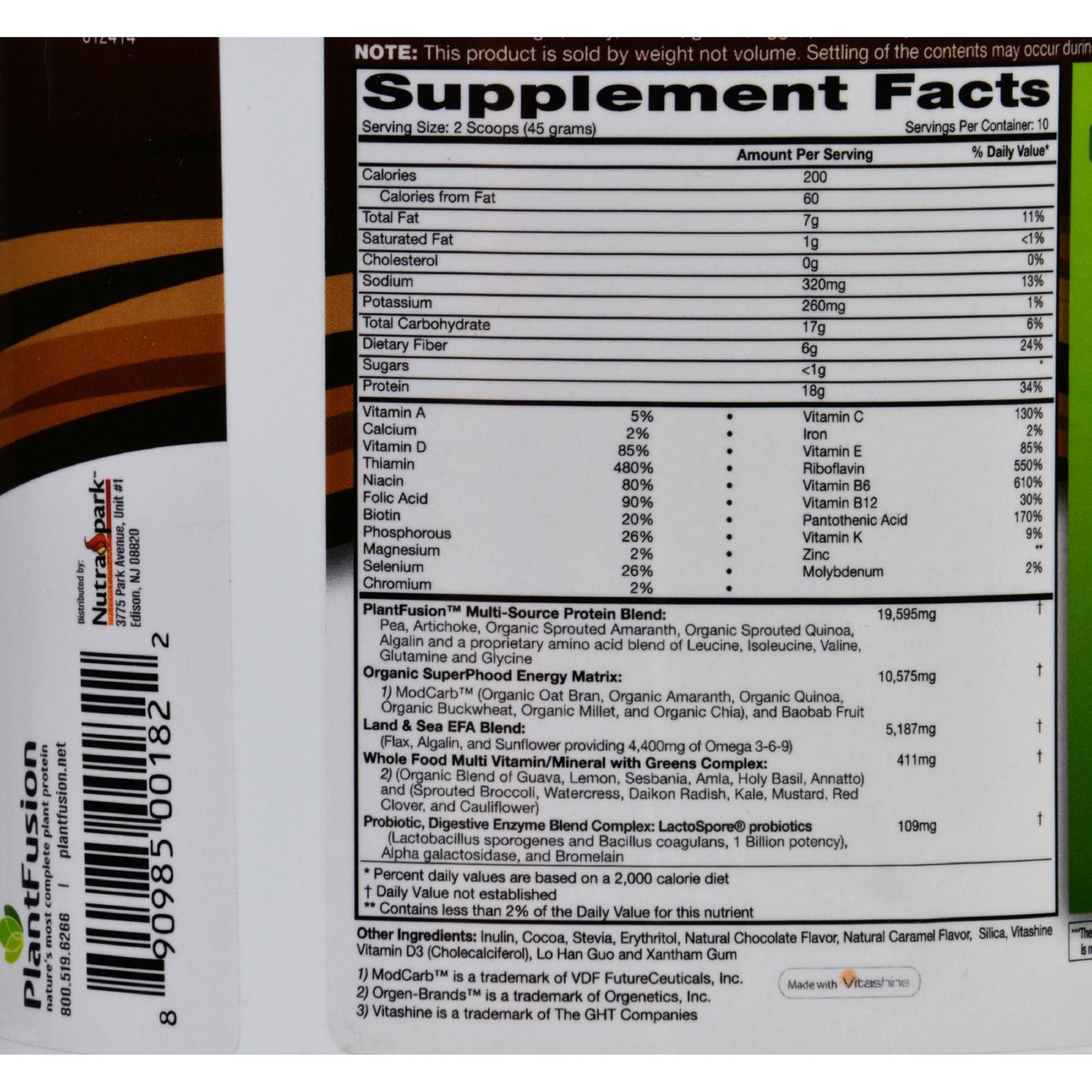 - Ingredients: PLANT FUSION PROTEIN BLEND;PEA PROTEIN ISOLATE;ARTICHOKE LEAF;ORGANIC AMARANTH;ORGANIC QUINOA AND ALGAE PROTEIN;MODCARB™;ORGANIC OAT BRAN;ORGANIC BUCKWHEAT;ORGANIC MILLET;ORGANIC QUINOA;ORGANIC CHIA;SUNFLOWER SEED OIL POWDER;INULIN;COCOA;NATURAL FLAVORS;FLAX SEED OIL POWDER;STEVIA LEAF EXTRACT;REB A;ERYTHRITOL;BAOBAB FRUIT POWDER;‡ORGEN™ ORGANIC VITAMIN/MINERAL BLEND;ORGANIC GUAVA EXTRACT;ORGANIC LEMON EXTRACT;ORGANIC AMLA EXTRACT;ORGANIC SESBANIA EXTRACT;ORGANIC HOLY BASIL EXTRACT;AND ORGANIC A