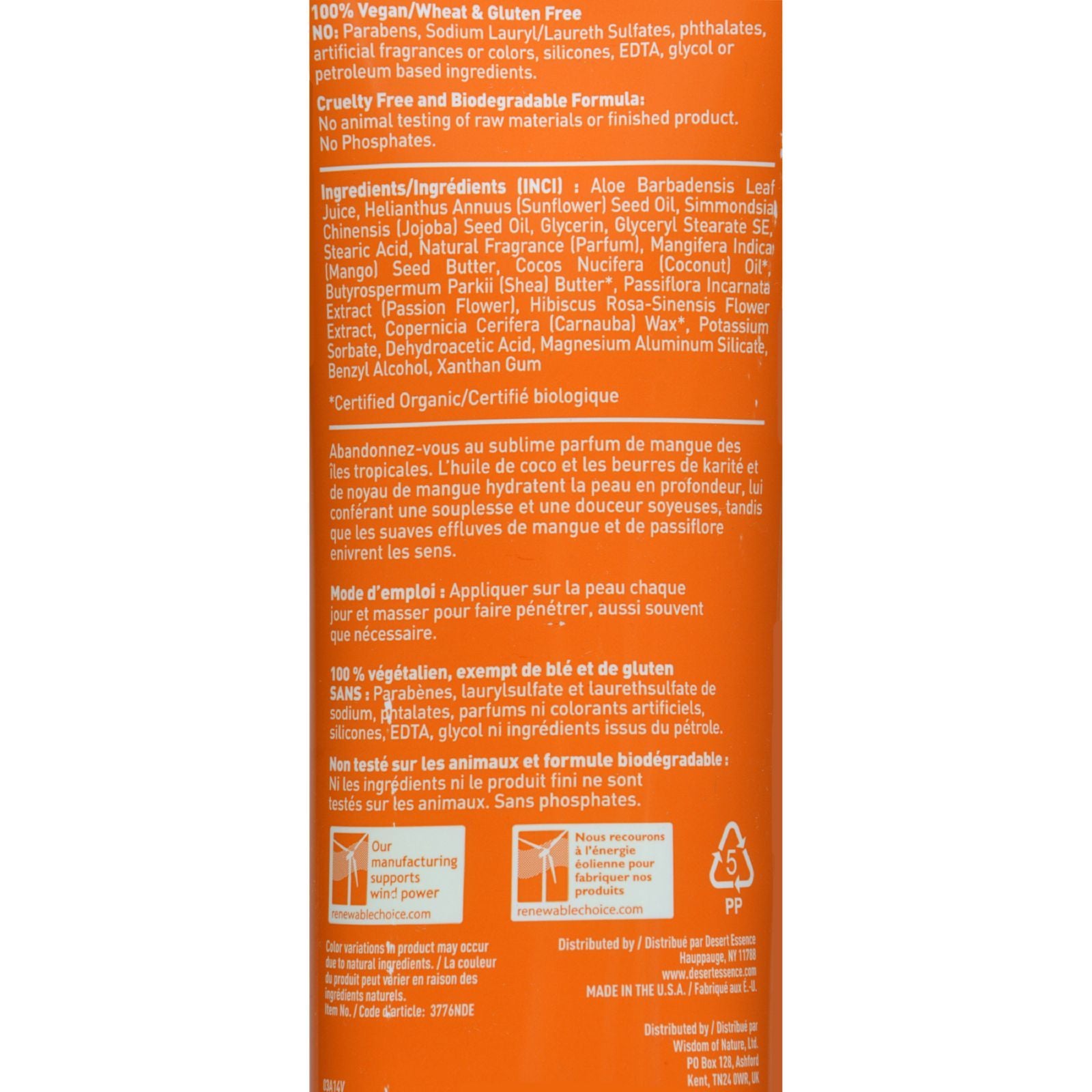 DESERT ESSENCE ISLAND MANGO HAND & BODY LOTION OFFERS DEEP MOISTURIZING BENEFITS TO HELP KEEP YOUR SKIN FEELING SMOOTH AND SILKY. OUR 8 FL. OZ. LOTION, ENRICHED WITH COCONUT OIL, SHEA BUTTER AND JOJOBA OIL, FEATURES A NATURAL TROPICAL MANGO SCENT WITH SUBTLE HINTS OF PASSION FLOWER ESSENCES, WHICH DELIGHTS AND REVITALIZES THE SENSES. SUITED FOR PEOPLE WHO ARE ON A VEGAN DIET, THIS WHEAT- AND GLUTEN-FREE LOTION FEELS LIGHTWEIGHT ON THE SKIN THANKS TO ITS GREASE-FREE FORMULATION.