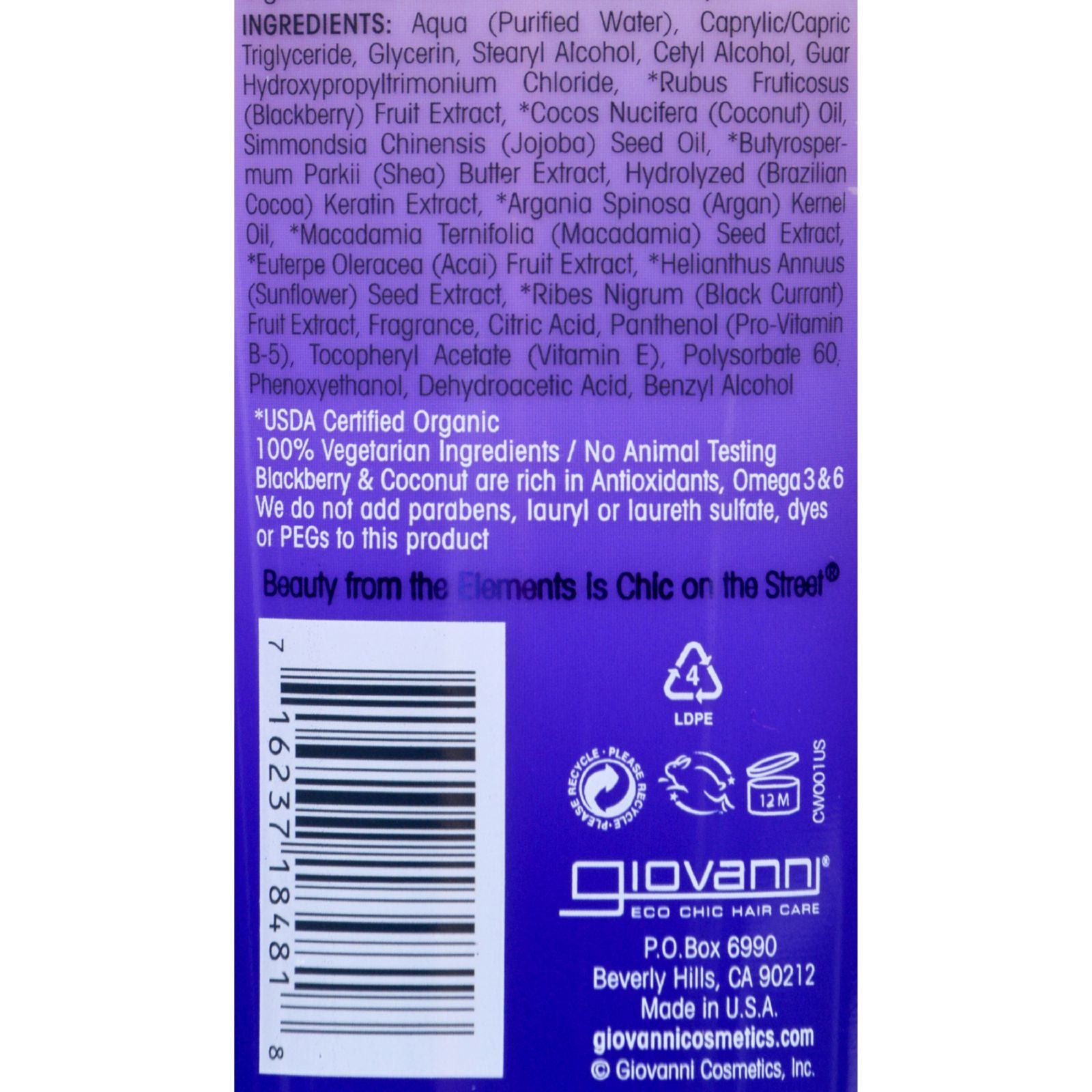 GIOVANNI, CONDITIONER 2CHIC REPAIRING CONDITIONER WITH BLACKBERRY & COCONUT MILK IS A PRODUCT YOU CAN COUNT ON. IT IS MADE WITHOUT ANY TESTING ON ANIMALS, AND IS ORGANIC AND VEGETARIAN. FORMULATED FOR DAMAGED, OVER-PROCESSED HAIR, IT DOESN'T CONTAIN ANY DYES, PARABENS OR OTHER HARMFUL CHEMICALS, INCLUDING PEGS. THE RICH, ANTIOXIDANT POWER OF BLACKBERRY AND COCONUT WILL LEAVE YOUR HAIR FEELING GREAT. EACH TUBE CONTAINS 8.5 FL. OZ. OF CONDITIONER.