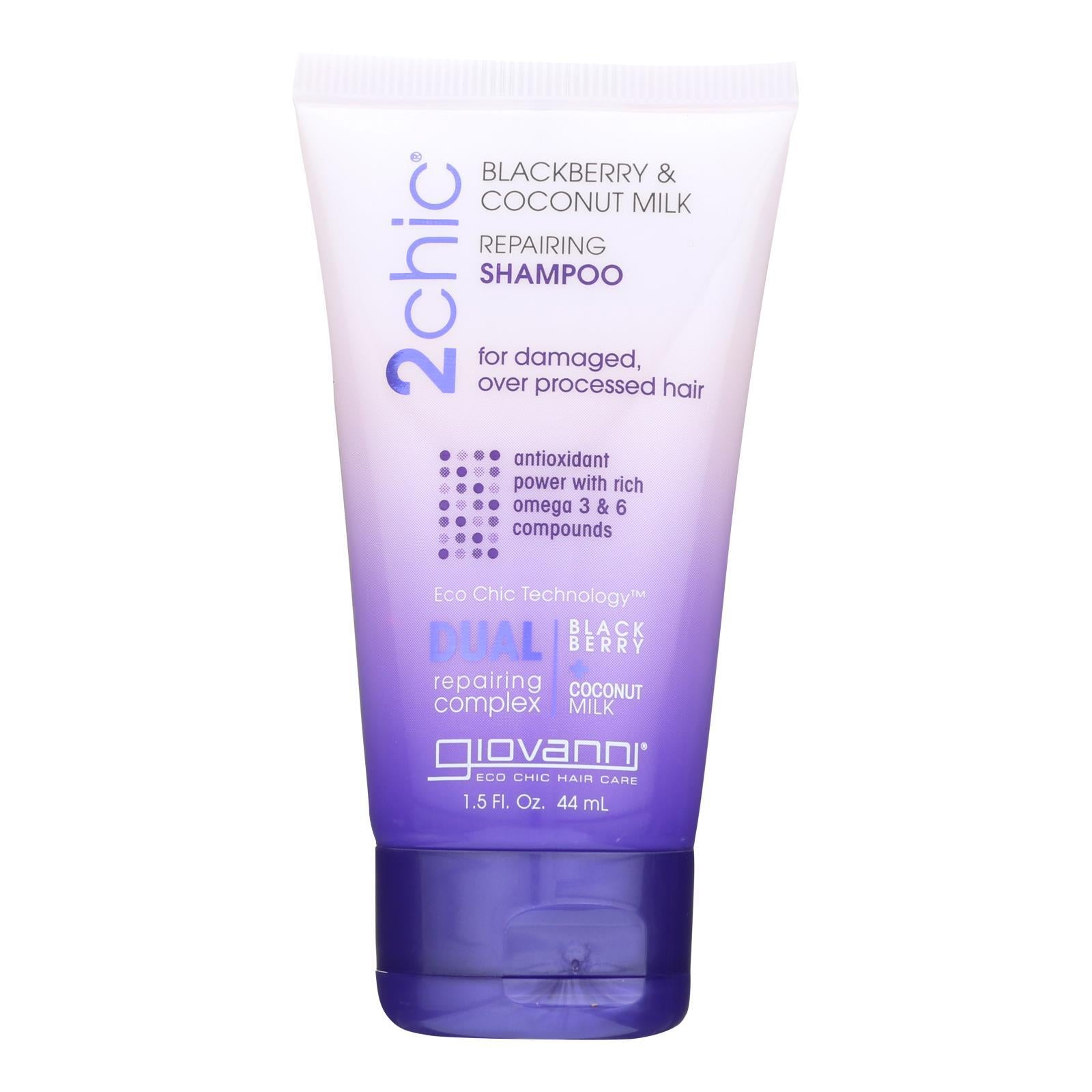 GIOVANNI, SHAMPOO 2CHIC REPAIRING SHAMPOO WITH BLACKBERRY & COCONUT MILK IS A TRAVEL SIZED PRODUCT YOU CAN COUNT ON. IT IS MADE WITHOUT ANY TESTING ON ANIMALS, AND IS ORGANIC AND VEGETARIAN. FORMULATED FOR DAMAGED, OVER-PROCESSED HAIR, THERE ARE NO DYES, PARABENS OR OTHER HARMFUL CHEMICALS, INCLUDING PEGS. THE RICH, ANTIOXIDANT POWER OF BLACKBERRY AND COCONUT WILL LEAVE YOUR HAIR FEELING GREAT. EACH BOTTLE CONTAINS 1.5 FL. OZ. OF SHAMPOO.