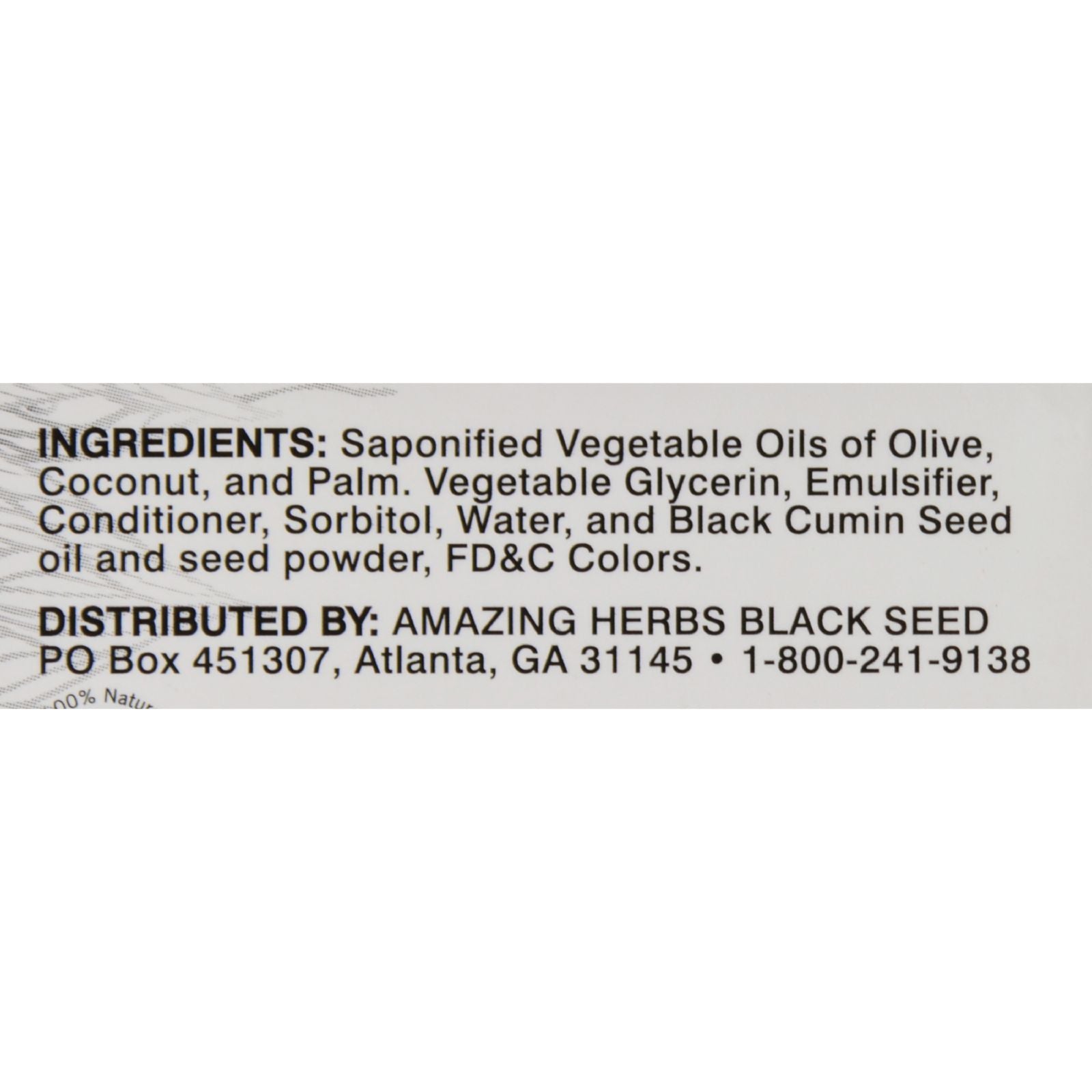AMAZING HERBS Black Seed VEGETABLE GLYCERIN SOAP hydrates and attracts moisture to skin. Excellent for sensitive skin, it is formulated with 100% Pure, Cold-Pressed Black Cumin Seed oil and provides the skin nourishing EFA's (Essential Fatty Acids) and Anti-Oxidants along with ground Black Cumin, Vegetable Glycerin, Olive and Coconut Oils, to help soften skin and restore its natural balance.