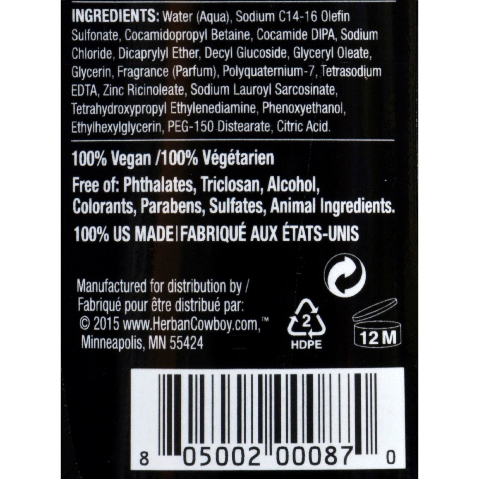 HERBAN COWBOY BODY WASH, DUSK IS 100% VEGAN. THIS PRODUCT IS NATURALLY DEODORIZING AND DOES NOT CONTAIN ANIMAL INGREDIENTS, PARABENS OR ALCOHOL, MAKING THIS DEODORANT A GREAT CHOICE FOR YOUR NEXT HYGIENIC PRODUCT. HERBAN COWBOY BODY WASH, DUSK COMES PACKAGED FOR YOUR CONVENIENCE IN A RECYCLABLE BOTTLE AND CONTAINS 18 FL. OZ. OF PRODUCT.