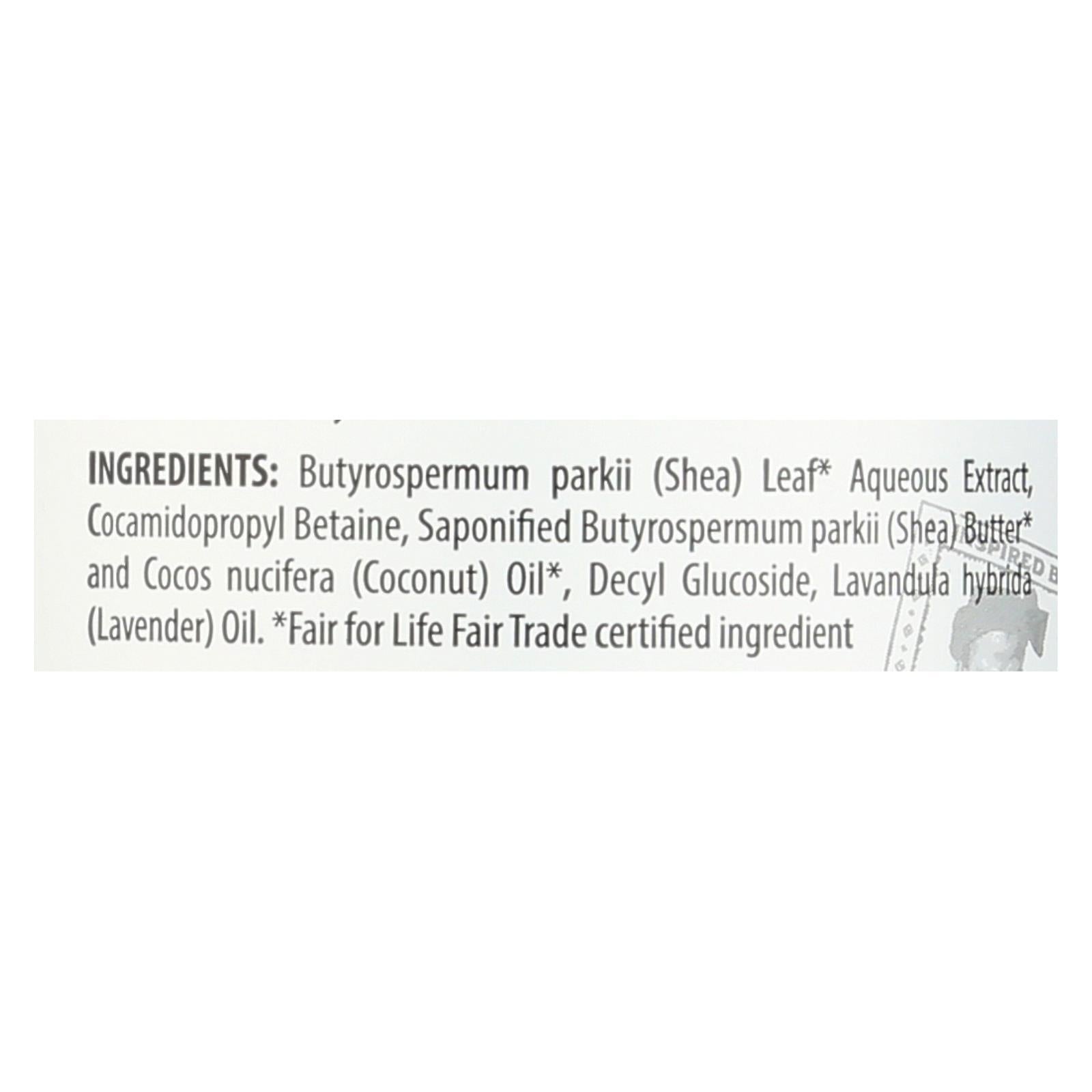 - Ingredients: BUTYROSPERMUM PARKII (SHEA) LEAF AQUEOUS EXTRACT;SAPONIFIED BUTYROSPERMUM PARKII (SHEA) BUTTER AND COCOS NUCIFERA (COCONUT) OIL;COCO-BETAINE;DECYL GLUCOSIDE;LAVANDULA HYBRIDA (LAVENDER) OIL