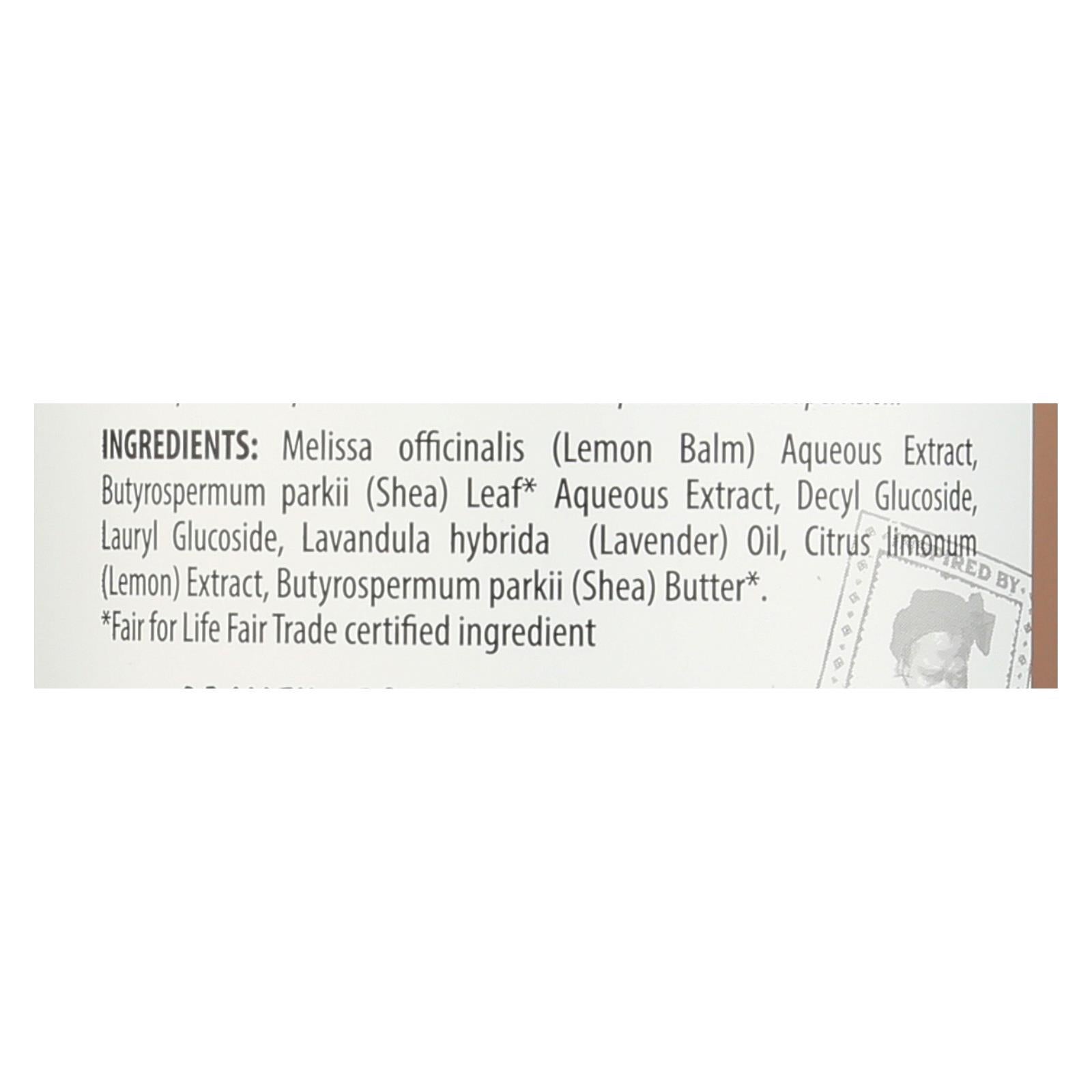 - Ingredients: MELISSA OFFICINALIS;LEMON BALM;AQUEOUS EXTRACT;BUTYROSPERMUM PARKII;SHEA;LEAF AQUEOUS EXTRACT;DECYL GLUCOSIDE;LAURYL GLUCOSIDE;LAVANDULA HYBRIDA;LAVENDER;OIL;CITRUS LIMONUM;LEMON;EXTRACT;BUTTER