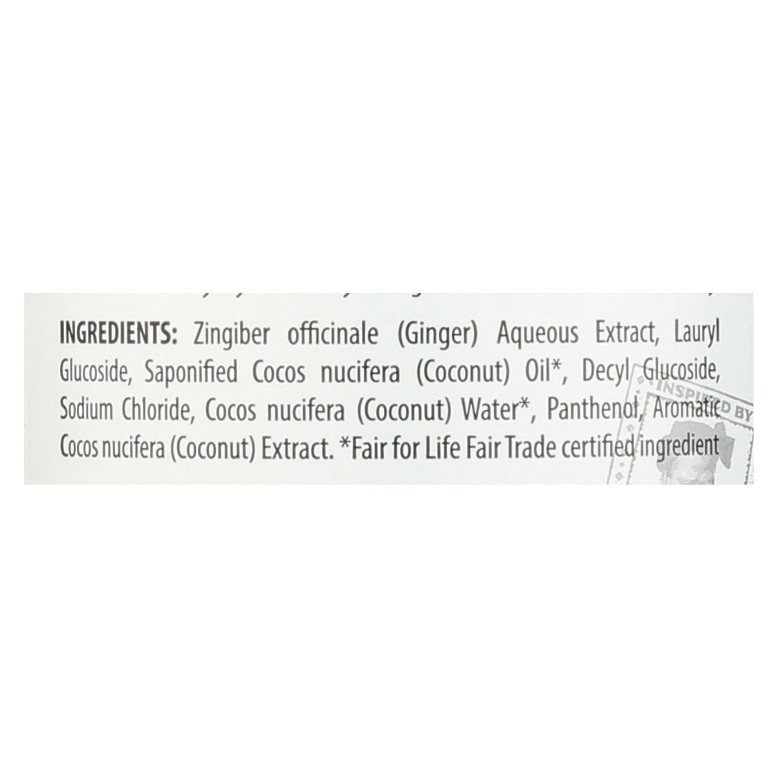 - Ingredients: ZINGIBER OFFICINALE (GINGER) AQUEOUS EXTRACT;LAURYL GLUCOSIDE;SAPONIFIED COCOS NUCIFERA (COCONUT) OIL;DECYL GLUCOSIDE;SODIUM CHLORIDE;COCOS NUCIFERA (COCONUT) WATER;PANTHENOL;COCOS NUCIFERA (COCONUT) EXTRACT