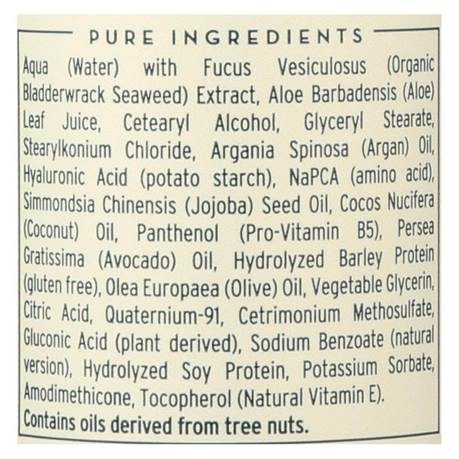 - Ingredients: AQUA;WATER;WITH FUCUS VESICULOSUS;BLADDERWRACK SEAWEED;AND CHLORELLA VULGARIS EXTRACTS;CETEARYL ALCOHOL;ALOE BARBADENSIS;ALOE VERA;LEAF JUICE;STEARALKONIUM CHLORIDE;ARGANIA SPINOSA KERNEL;ARGAN;OIL;GLYCERYL STEARATE;PERSEA GRATISSIMA;AVOCADO;CAPRYLIC/CAPRIC TRIGLYCERIDE;SIMMONDSIA CHINENSIS;JOJOBA;SEED OILS;SODIUM DEHYDROACETATE;CITRIC ACID;POTASSIUM SORBATE;PANTHENOL;VITAMIN B-5;SODIUM HYALURONATE;HYALURONIC ACID;SODIUM PCA;NAPCA;HYDROLYZED BARLEY PROTEIN;COCOS NUCIFERA;COCONUT;CAESALPINIA SPIN