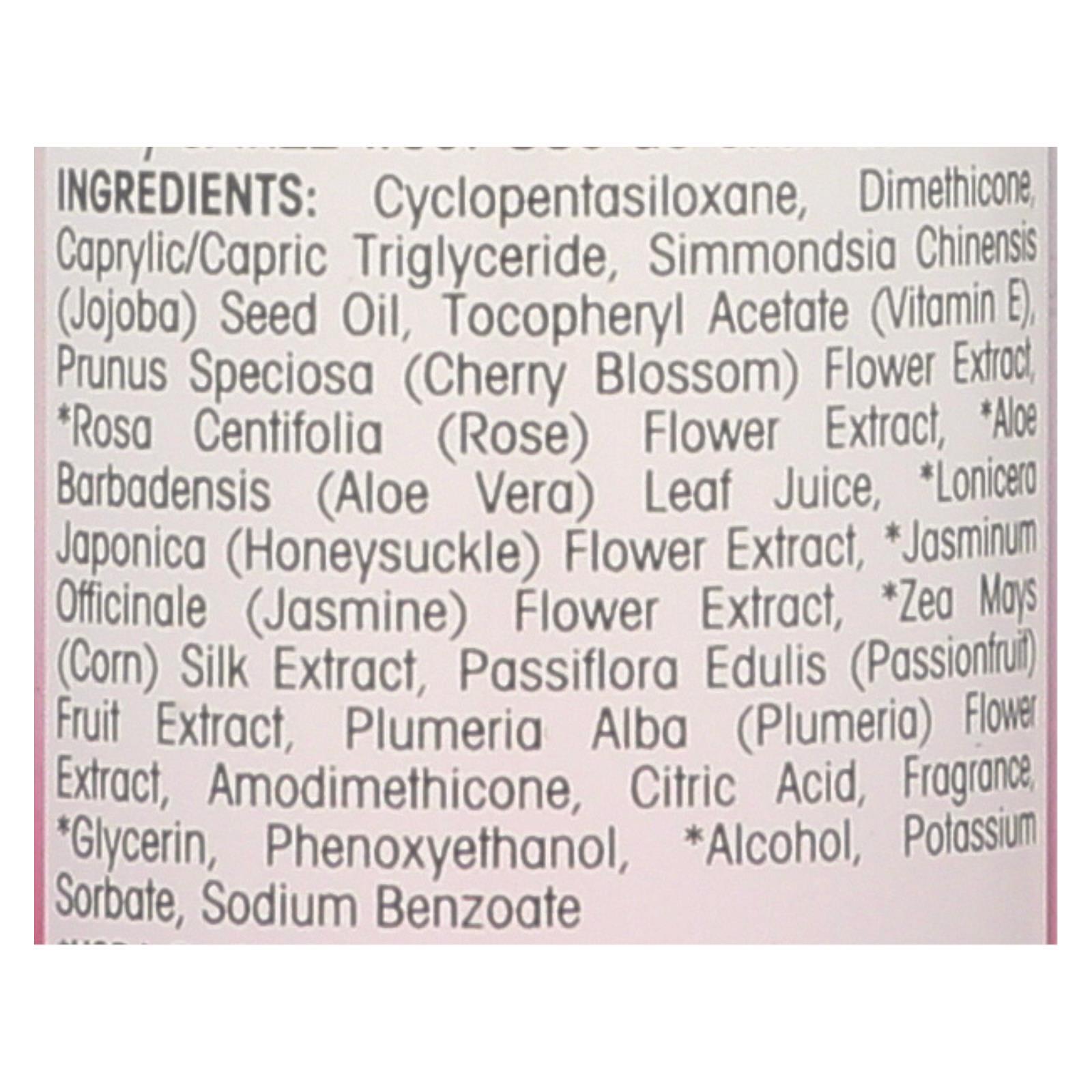 - Ingredients: CYCLOPENTASILOXANE;DIMETHICONE;CAPRYLIC/CAPRIC TRIGLYCERIDE;SIMMONDSIA CHINENSIS;JOJOBA;SEED OIL;TOCOPHERYL ACETATE;VITAMIN E;PRUNUS SPECIOSA;CHERRY BLOSSOM;FLOWER EXTRACT;ROSA CENTIFOLIA;ROSE;ALOE BARBADENSIS;ALOE VERA;LEAF JUICE;LONICERA JAPONICA;HONEYSUCKLE;JASMINUM OFFICINALE;JASMINE;ZEA MAYS;CORN;SILK EXTRACT;PASSIFLORA EDULIS;PASSIONFRUIT;FRUIT EXTRACT;PLUMERIA ALBA;PLUMERIA;AMODIMETHICONE;CITRIC ACID;FRAGRANCE;GLYCERIN;PHENOXYETHANOL;ALCOHOL;POTASSIUM SORBATE;SODIUM BENZOATE