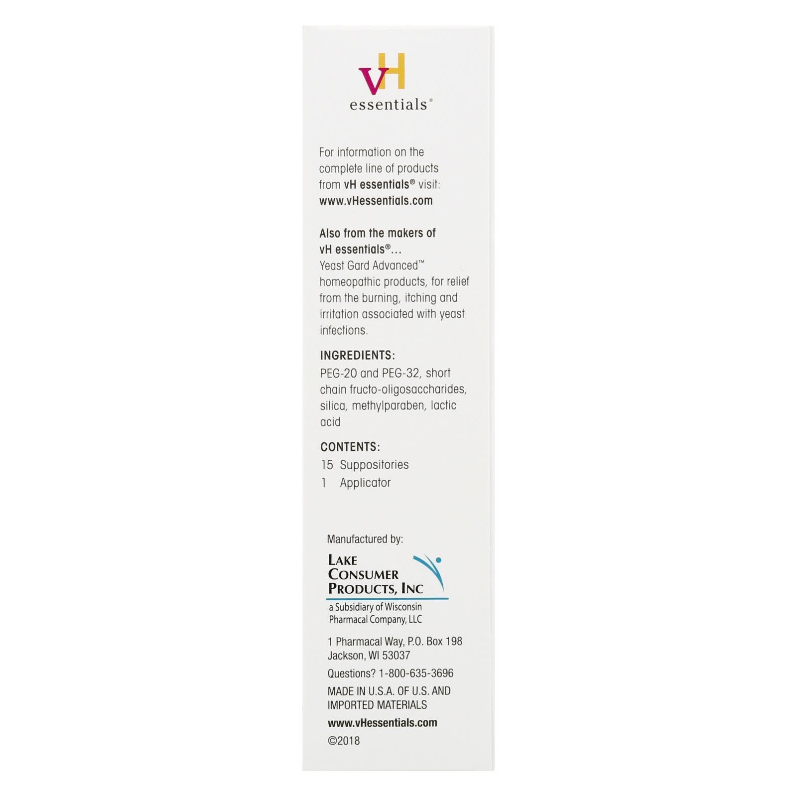 Contents: 15 suppositories; 1 applicator. Specially formulated with prebiotics & lactic acid to help. 1. Naturally protect against odor. 2. Maintain balance, freshness and confidence. Exclusive patented formula. We all have more confidence when we feel balanced, fresh and clean. However, unwanted vaginal odor can make it hard to feel fresh and clean, and can seriously impact a woman's confidence. vH Essentials Prebiotic Suppositories feature a unique patented formula enriched with nourishing prebiotics and pH balancing lactic acid. vH Essentials Prebiotic Suppositories are delivered directly to the vagina where they can help support balance, promote freshness and protect against embarrassing vaginal odor so you can feel confident again. Also from the makers of vH Essentials: Yeast Gard Advanced homeopathic products, for relief from the burning, itching and irritation associated with yeast infections. www.vHessentials.com. For information on the complete line of products from vH Essentials visit: www.vHessentials.com. Questions? 1-800-635-3696. Try these vH Essentials products to help treat, reduce and prevent women's most common feminine health issues: Vaginal Odor Treatment - Fast and effective elimination of unpleasant vaginal odor. Probiotic with Prebiotics & Cranberry Daily Feminine Supplement - Triple action formula delivers probiotics, prebiotics and clinically tested cranberry to support microbial balance and urinary health for complete feminine tract care. Tea Tree Oil & Prebiotic Daily Feminine Wash - Gently cleanses sensitive intimate areas, providing pH balanced odor defense with vH Microbalance odor blocking technology. Made in U.S.A. of U.S. and imported materials.