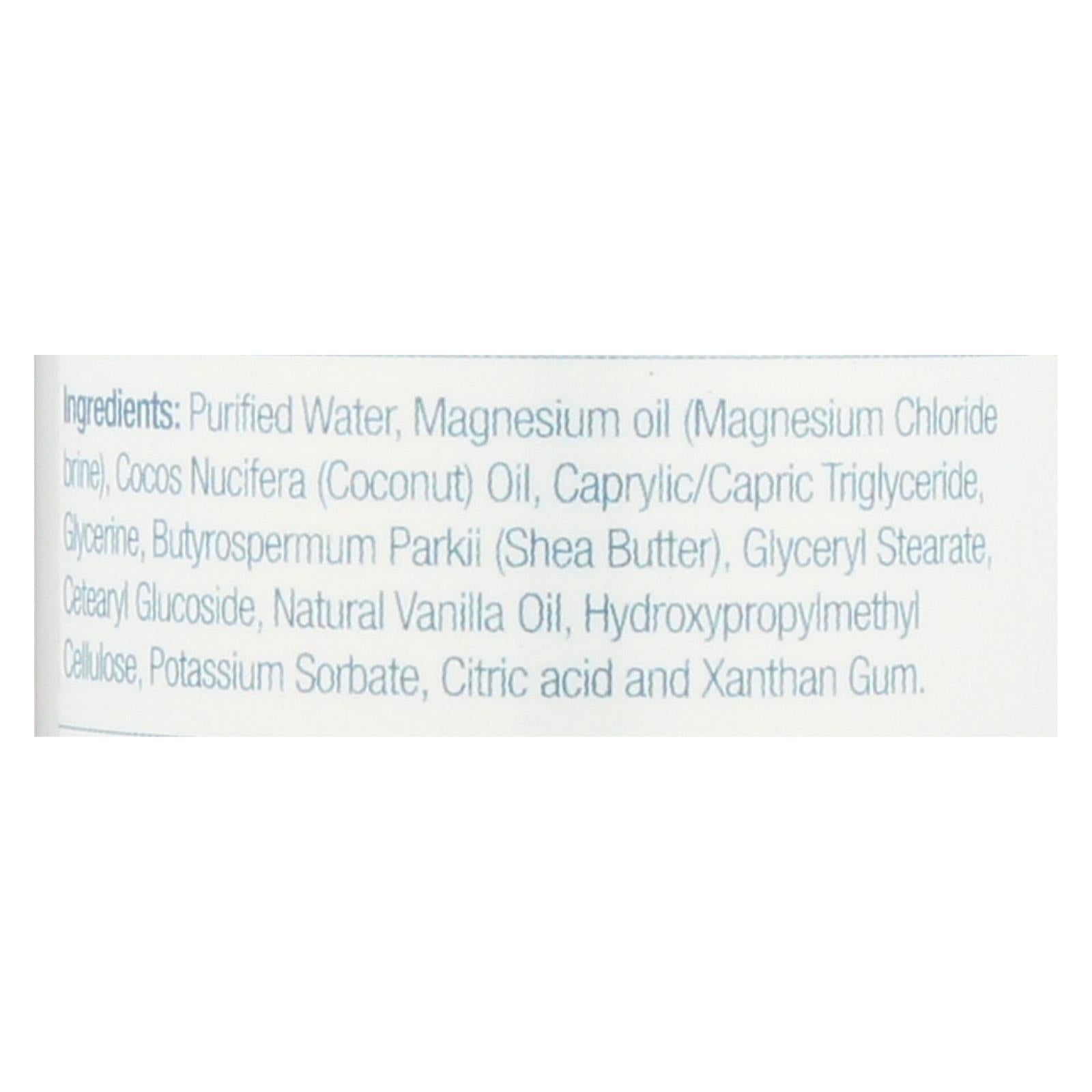 - Ingredients: AQUA;MAGNESIUM OIL (MAGNESIUM CHLORIDE BRINE);COCOS NUCIFERA (COCONUT) OIL;GLYCERIN;CAPRYLIC/CAPRIC TRIGLYCERIDE;BUTYROSPERMUM PARKII (SHEA) BUTTER;GLYCERYL STEARATE SE;EMULSIFYING WAX NF;CETEARYL GLUCOSIDE;CETEARYL ALCOHOL;FRAGRANCE;HYDROXYPROPYL METHYLCELLULOSE;POTASSIUM SORBATE;CITRIC ACID;XANTHAN GUM
