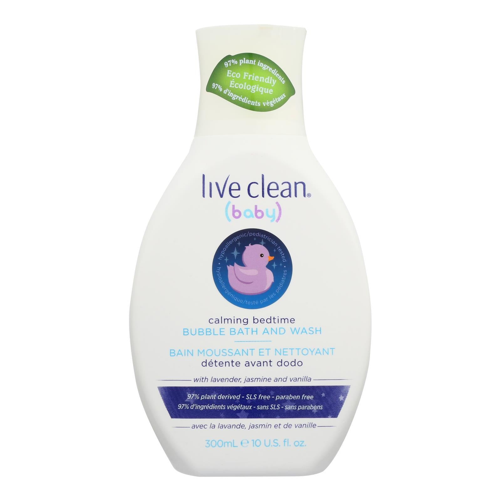 With lavender, jasmine and vanilla. 97% plant derived. SLS free. Paraben free. Plant derived. With certified organic botanicals. SLS free. Petrolatum free. DEA free. Paraben free. Phthalate free. Phosphate free. Dye free. Pure vegan. Never tested on animals. Package recyclable. Contains biodegradable ingredients. Hypoallergenic. Pediatrician tested. Live clean Baby Calming Bedtime Bubble Bath and Wash is a clinically tested, mild, tear-free formula that gently cleanses while softening baby's skin with moisturizing Coconut and Safflower Oil. With a calming blend of lavender, chamomile, jasmine and vanilla extracts and essential oils to relax and comfort baby at bedtime. Questions? 1-800-668-1118. www.live-clean.com. Made in Canada.