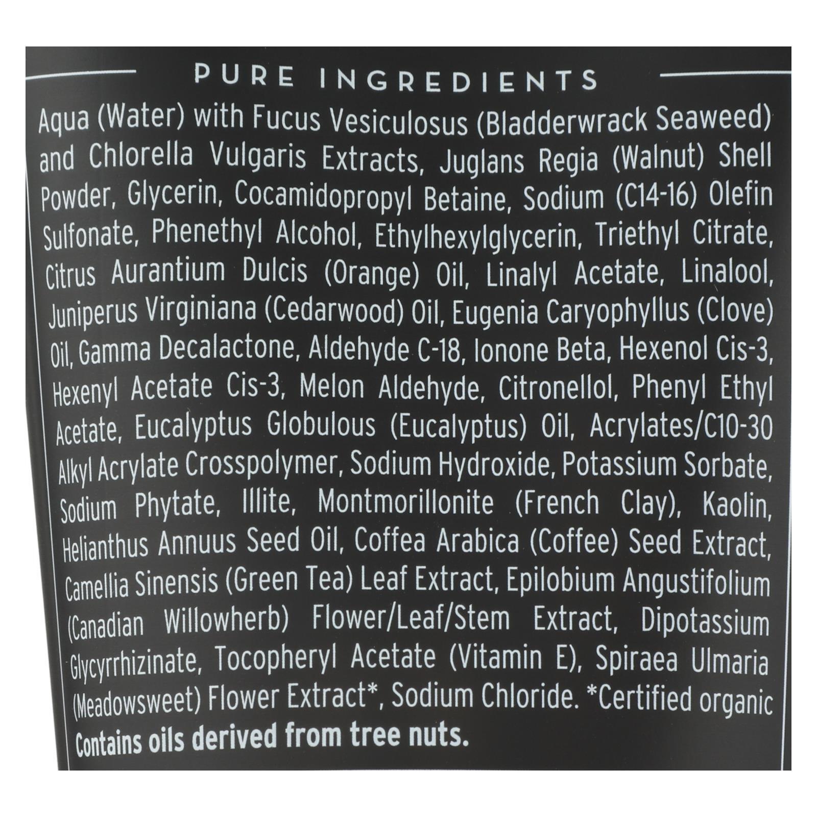 - Ingredients: AQUA;WATER;WITH FUCUS VESICULOSUS;BLADDERWRACK SEAWEED;AND CHLORELLA VULGARIS EXTRACTS;JUGLANS REGIA;WALNUT;SHELL POWDER;GLYCERIN;COCAMIDOPROPYL BETAINE;SODIUM;C14-16;OLEFIN SULFONATE;PHENETHYL ALCOHOL;ETHYLHEXYLGLYCERIN;TRIETHYL CITRATE;CITRUS AURANTIUM DULCIS;ORANGE;OIL;LINALYL ACETATE;LINALOOL;JUNIPERUS VIRGINIANA;CEDARWOOD;EUGENIA CARYOPHYLLUS;CLOVE;GAMMA DECALACTONE;ALDEHYDE C-18;IONONE BETA;HEXENOL CIS-3;HEXENYL ACETATE CIS-3;MELON ALDEHYDE;CITRONELLOL;PHENYL ETHYL ACETATE;EUCALYPTUS GLOBU