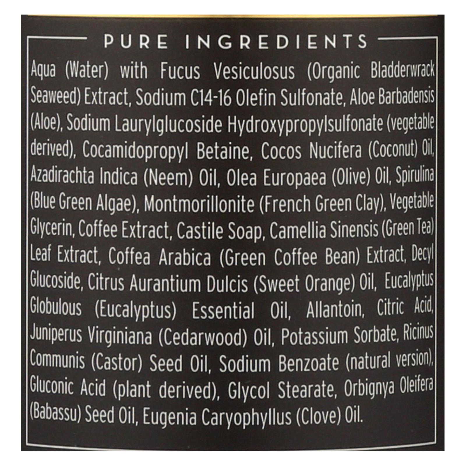 - Ingredients: AQUA;WATER;WITH FUCUS VESICULOSUS;BLADDERWRACK SEAWEED;AND CHLORELLA VULGARIS EXTRACTS;SODIUM;C14-16;OLEFIN SUFFOCATE COCAMIDOPROPYL BETAINE;GLYCERIN;COCOS NUCIFERA;COCONUT;OIL;MELIA AZADIRACHTA;NEEM;SEED OIL;ALOE BARBADENSIS;ALOE VERA;LEAF JUICE;COFFEE ARABICA SEED EXTRACT;CAMELLIA SINENSIS;GREEN TEA;LEAF EXTRACT;OLEA EUROPAEA;OLIVE;FRUIT OIL;CITRUS AURANTIUM DULCIS;ORANGE;LINALYL ACETATE;LINALOOL;JUNIPERUS VIRGINIANS;CEDARWOOD;EUGENIA CARYOPHYLLUS;CLOVE;GAMMA DECALACTONE;ALDEHYDE C-18;LONONE