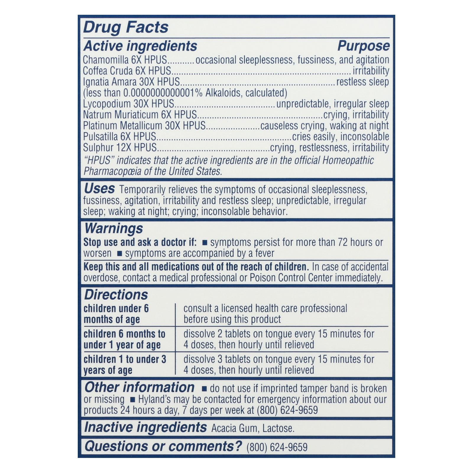 Other Information: Do not use if imprinted tamper band is broken or missing. Hyland's may be contacted for emergency information about our products 24 hours a day, 7 days per week at (800) 624-9659. Misc: Homeopathic. Natural relief of occasional sleeplessness, fussiness, and irritability. Ages 6 months +. Dissolves instantly in mouth! Since 1903. Natural relief. No artificial flavors, dyes or parabens. www.hylands.com. Visit www.hylandsbaby.com. With a century of commitment, Hyland's provides quality and integrity across our entire family of products. Why use Calming Tablets? Scan the QR code to find out why other moms love them. Please recycle. (The uses for our products are based upon traditional homeopathic practices. They have not been reviewed by the Food and Drug Administration.)