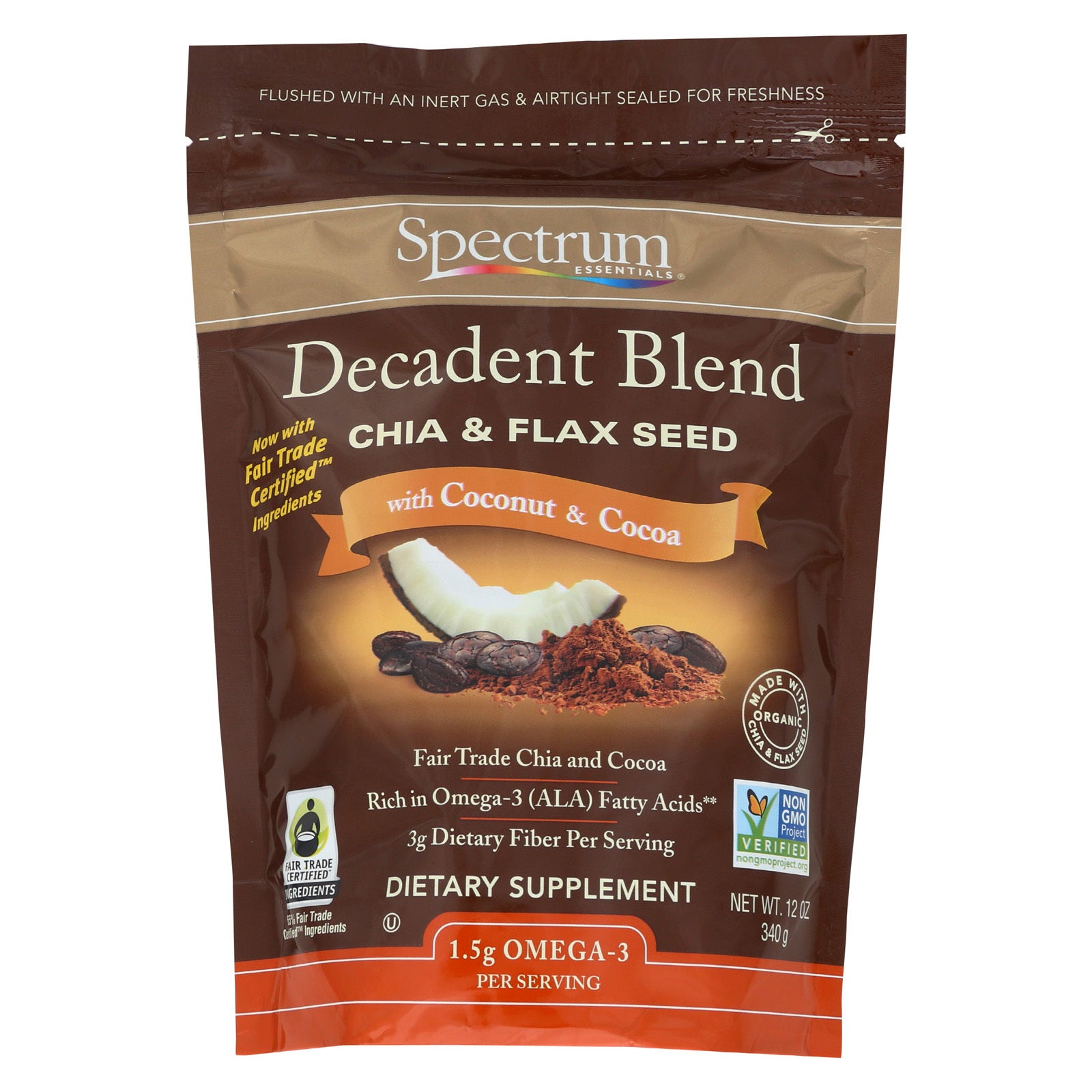 SPECTRUM ESSENTIALS' DECANDENT CHIA BLEND COMBINES ORGANIC GROUND FLAX SEED WITH FAIR TRADE GROUND CHIA SEED AND HIGH-QUALITY COCOA POWDER FOR A RICH SUPPLEMENT TO YOUR DAILY DIET. ADD A 2 TBSP. SERVING TO HOT CEREALS, YOGURT, SMOOTHIES, PUDDING, PANCAKES, WAFFLES AND BAKED GOODS EVERY DAY TO ENJOY THE FULL BENEFITS. 1.5 G. OF OMEGA-3 FATTY ACIDS HELPS SUPPORT NORMAL CARDIOVASCULAR FUNCTION AND 3 G. OF DIETARY FIBER HELPS SUPPORT THE NORMAL FUCTION OF THE DIGESTIVE SYSTEM. EACH LIGHT-PROTECTIVE 12 OZ. POUCH HAS BEEN FLUSHED WITH AN INERT GAS AND SEALED AIRTIGHT. THIS PROCESS ENSURES THAT THE DECADENT BLEND STAYS FRESH AND PROVIDES THE OPTIMUM HEALTH BENEFITS. SEE WARNING LABLE FOR RISKS AND WARNINGS.