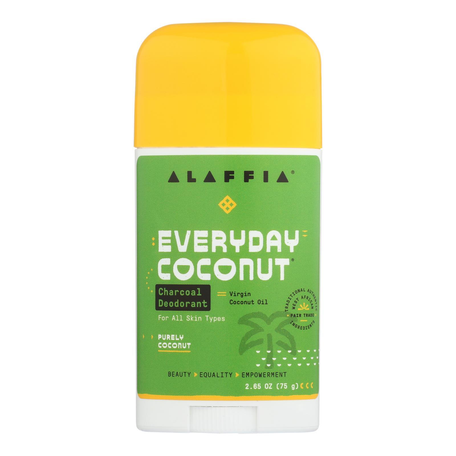 ALAFFIA REFRESHING COCONUT DEODORANT IS AN ALL-NATURAL PERSONAL HYGIENE PRODUCT THAT USES SUCH CERTIFIED FAIR TRADE INGREDIENTS AS COCONUT OIL, SHEA BUTTER, ALOE VERA LEAF JUICE, ACTIVATED CHARCOAL, NEEM OIL AND AROMATIC COCONUT EXTRACT FOR FRAGRANCE. IT'S FREE OF PARABENS, PHTHALATES, SULFATES, TRICLOSAN, PETRO CHEMICALS AND ALUMINUM, AND NO ANIMAL TESTING WAS INVOLVED IN ITS DEVELOPMENT. THE DEODORANT COMES IN A 2.65 OZ. UNIT.