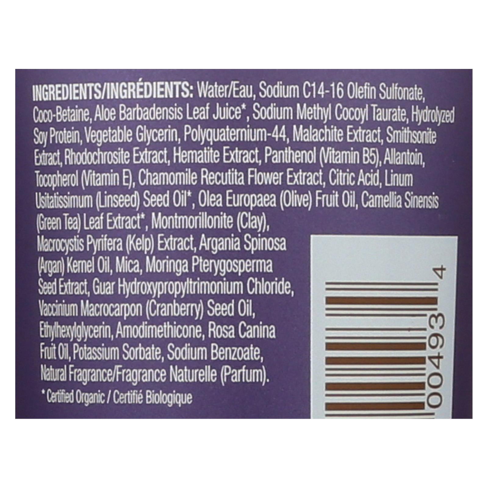 - Ingredients: WATER;SODIUM C14-16 OLEFIN SULFONATE;COCO-BETAINE;ALOE BARBADENSIS LEAF JUICE;SODIUM METHYL COCOYL TAURATE;HYDROLYZED SOY PROTEIN;VEGETABLE GLYCERIN;POLYQUATERNIUM-44;MALACHITE EXTRACT;SMITHSONITE EXTRACT;RHODOCHROSITE EXTRACT;HEMATITE EXTRACT;PANTHENOL;VITAMIN B5;ALLANTOIN;TOCOPHEROL;VITAMIN E;CHAMOMILE RECUTITA FLOWER EXTRACT;CITRIC ACID;LINUM USITATISSIMUM;LINSEED;SEED OIL;OLEA EUROPAEA;OLIVE;FRUIT OIL;CAMELLIA SINENSIS;GREEN TEA;LEAF EXTRACT;MONTMORILLONITE;CLAY;MACROCYSTIS PYRIFERA;KELP;EXT