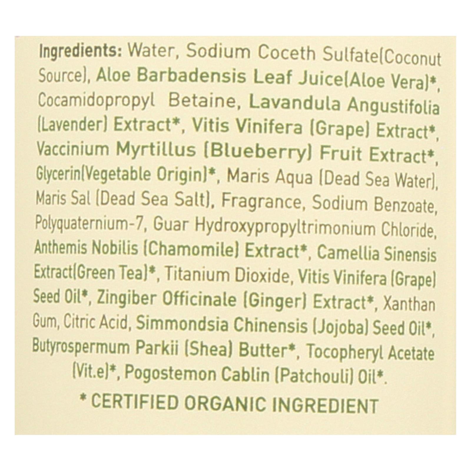 - Ingredients: WATER;SODIUM COCETH SULFATE;COCONUT SOURCE;ALOE BARBADENSIS LEAF JUICE;ALOE VERA;COCAMIDOPROPYL BETAINE;LAVANDULA ANGUSTIFOLIA;LAVENDER;EXTRACT;VITIS VINIFERA;GRAPE;VACCINIUM MYRTILLUS;BLUEBERRY;FRUIT EXTRACT;GLYCERIN;VEGETABLE ORIGIN;MARIS AQUA;DEAD SEA WATER;MARIS SAL;DEAD SEA SALT;FRAGRANCE;SODIUM BENZOATE;POLYQUATERNIUM-7;GUAR HYDROXYPROPYLTRIMONIUM CHLORIDE;ANTHEMIS NOBILIS;CHAMOMILE;CAMELLIA SINENSIS EXTRACT;GREEN TEA;TITANIUM DIOXIDE;SEED OIL;ZINGIBER OFFICINALE;GINGER;XANTHAN GUM;CITRIC