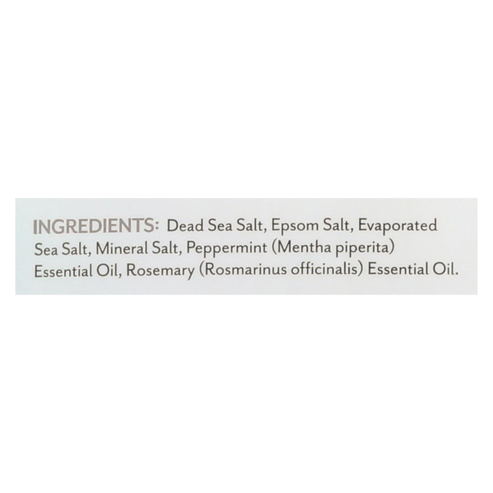 - Ingredients: DEAD SEA SALT;EPSOM SALT;EVAPORATED SEA SALT;MINERAL SALT;PEPPERMINT;MENTHA PIPERITA;ESSENTIAL OIL;ROSEMARY;ROSMARINUS OFFICINALIS