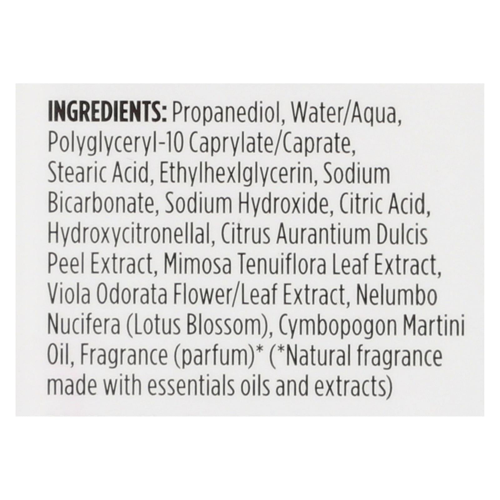 - Ingredients: PROPANEDIOL;WATER/AQUA;POLYGLYCERYL-10 CAPRYLATE/CAPRATE;STEARIC ACID;ETHYLHEXLGLYCERIN;SODIUM BICARBONATE;SODIUM HYDROXIDE;CITRIC ACID;HYDROXYCITRONELLAL;CITRUS AURANTIUM DULCIS PEEL EXTRACT;MIMOSA TENUIFLORA LEAF EXTRACT;VIOLA ODORATA FLOWER/LEAF EXTRACT;NELUMBO NUCIFERA;LOTUS BLOSSOM;CYMBOPOGON MARTINI OIL;FRAGRANCE;PARFUM