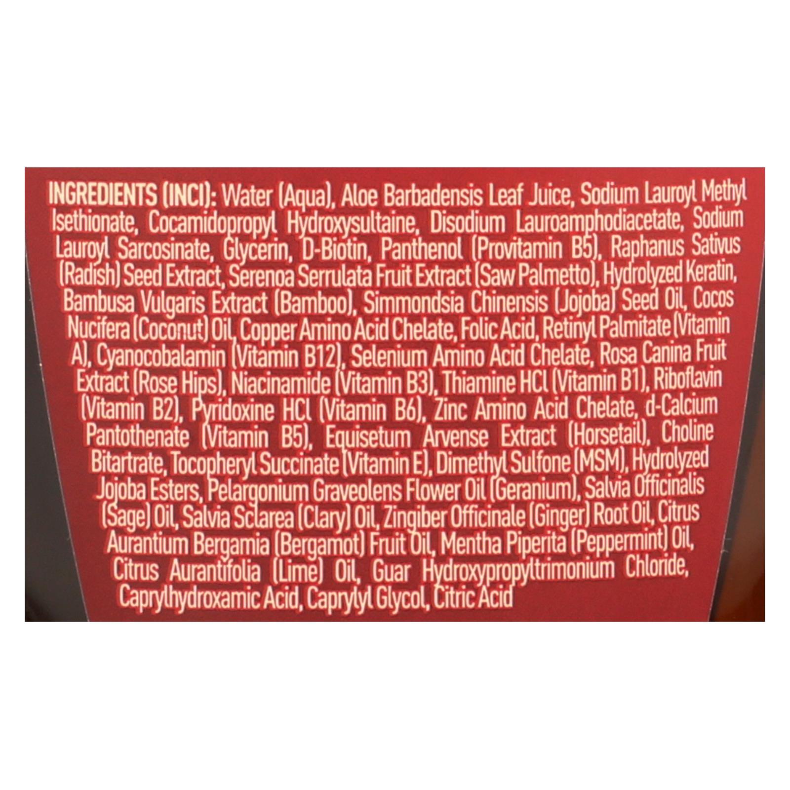 - Ingredients: WATER;AQUA;ALOE BARBADENSIS LEAF JUICE;SODIUM LAUROYL METHYL ISETHIONATE;COCAMIDOPROPYL HYDROXYSULTAINE;DISODIUM LAUROAMPHODIACETATE;SODIUM LAUROYL SARCOSINATE;GLYCERIN;D-BIOTIN;PANTHENOL;PROVITAMIN B5;RAPHANUS SATIVUS;RADISH;SEED EXTRACT;SERENOA SERRULATE FRUIT EXTRACT;SAW PALMETTO;HYDROLYZED KERATIN;BAMBUSA VULGARIS EXTRACT;BAMBOO;SIMMONDSIA CHINENSIS;JOJOBA;SEED OIL;COCOS NUCIFERA;COCONUT;OIL;COPPER AMINO ACID CHELATE;FOLIC ACID;RETINYL PALMITATE;VITAMIN A;CYANOCOBALAMIN;VITAMIN B12;SELENIUM