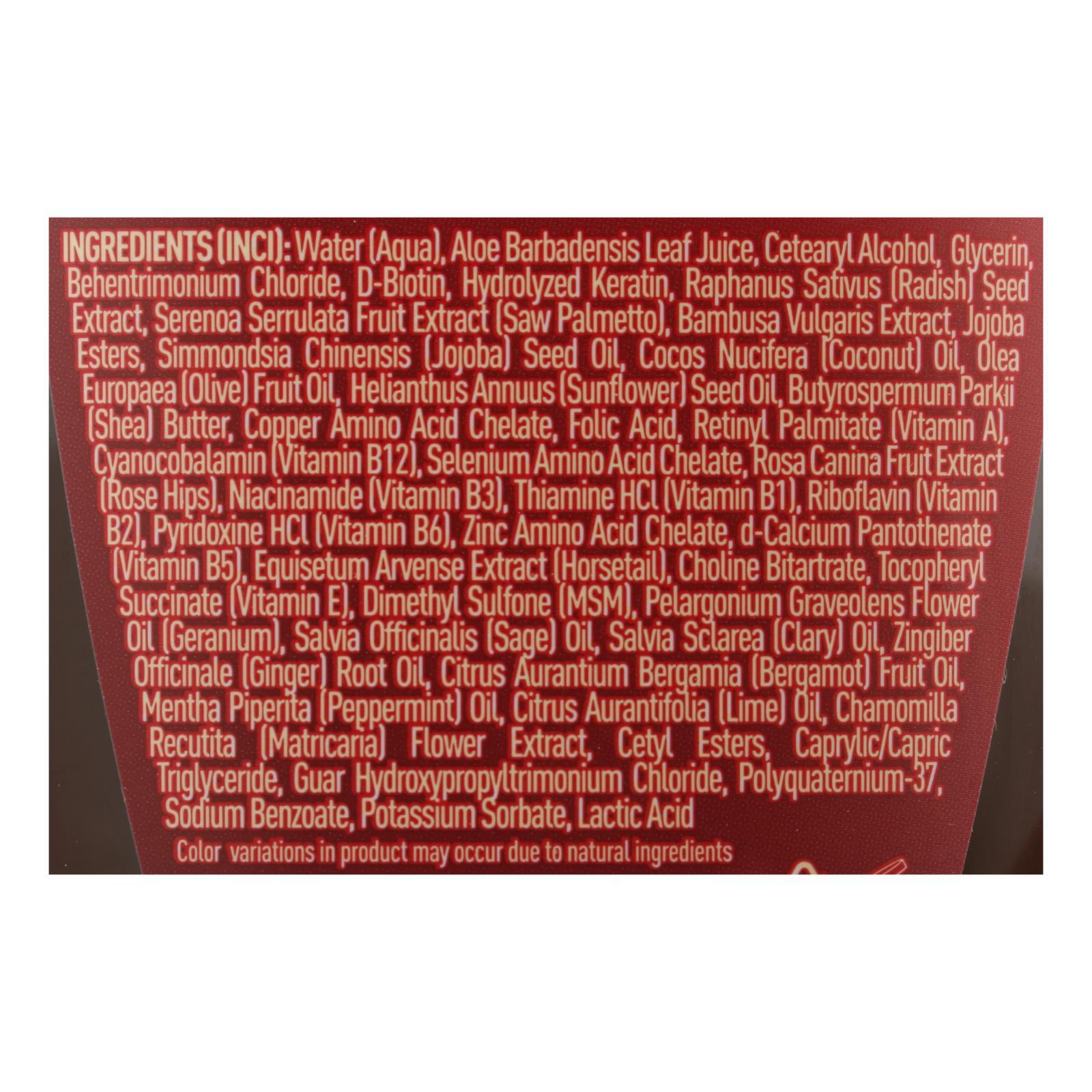 - Ingredients: WATER;AQUA;ALOE BARBADENSIS LEAF JUICE;CETEARYL ALCOHOL;GLYCERIN;BEHENTRIMONIUM CHLORIDE;D-BIOTIN;HYDROLYZED KERATIN;RAPHANUS SATIVUS;RADISH;SEED EXTRACT;SERENOA SERRULATA FRUIT EXTRACT [SAW PALMETTO];BAMBUSA VULGARIS EXTRACT;JOJOBA ESTERS;SIMMONDSIA CHINENSIS [JOJOBA] SEED OIL;COCOS NUCIFERA [COCONUT] OIL;OLEA EUROPAEA [OLIVE] FRUIT OIL;HELIANTHUS ANNUUS [SUNFLOWER] SEED OIL;BUTYROSPERMUM PARKII [SHEA] BUTTER;COPPER AMINO ACID CHELATE;FOLIC ACID;RETINYL PALMITATE [VITAMIN A];CYANOCOBALAMIN [VIT