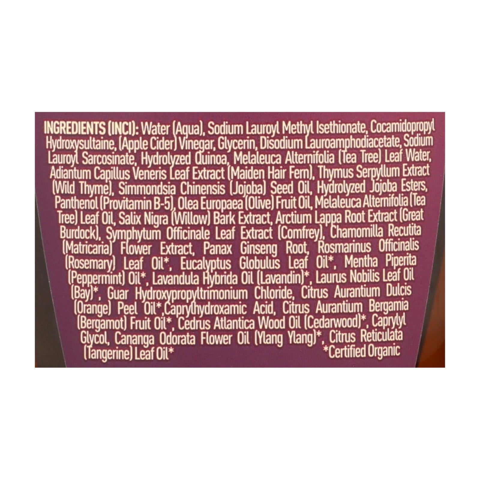 - Ingredients: WATER;AQUA;SODIUM LAUROYL METHYL ISETHIONATE;COCAMIDOPROPYL HYDROXYSULTAINE;APPLE CIDER;VINEGAR;GLYCERIN;DISODIUM LAUROAMPHODIACETATE;SODIUM LAUROYL SARCOSINATE;HYDROLYZED QUINOA;MELALEUCA ALTERNIFOLIA;TEA TREE;LEAF WATER;ADIANTUM CAPILLUS VENERIS LEAF EXTRACT;MAIDEN HAIR FERN;THYMUS SERPYLLUM EXTRACT;WILD THYME;SIMMONDSIA CHINENSIS;JOJOBA;SEED OIL;HYDROLYZED JOJOBA ESTERS;PANTHENOL;PROVITAMIN B-5;OLEA EUROPAEA;OLIVE;FRUIT OIL;LEAF OIL;SALIX NIGRA;WILLOW;BARK EXTRACT;ARCTIUM LAPPA ROOT EXTRACT;G