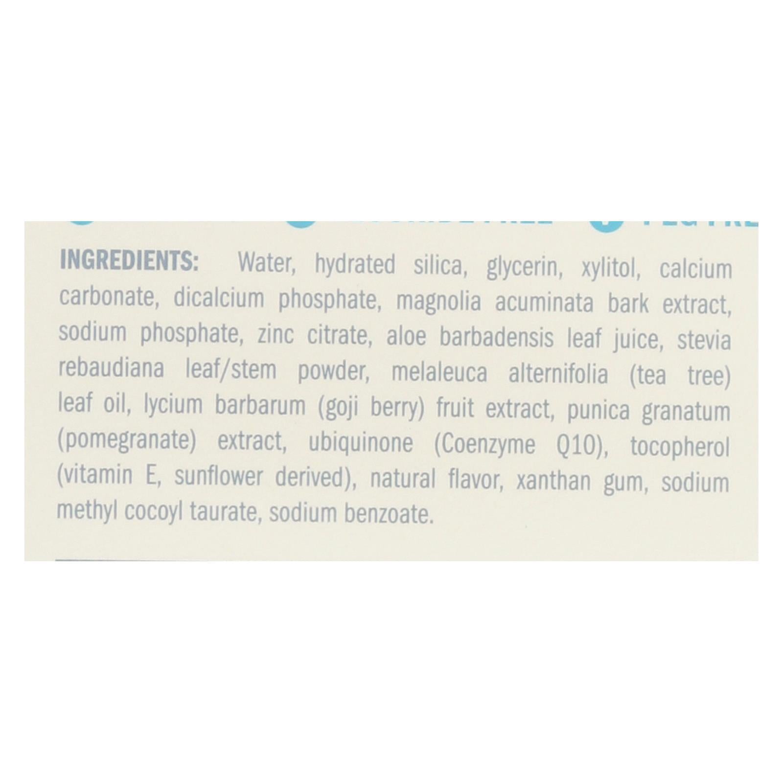 - Ingredients: WATER;HYDRATED SILICA;GLYCERIN;XYLITOL;CALCIUM CARBONATE;DICALCIUM PHOSPHATE;MAGNOLIA ACUMINATA BARK EXTRACT;SODIUM PHOSPHATE;ZINC CITRATE;ALOE BARBADENSIS LEAF JUICE;STEVIA REBAUDIANA LEAF/STEM POWDER;MELALEUCA ALTERNIFOLIA;TEA TREE;LEAF OIL;LYCIUM BARBARUM;GOJI BERRY;FRUIT EXTRACT;PUNICA GRANATUM;POMEGRANATE;EXTRACT;UBIQUINONE;COENZYME Q10;TOCOPHEROL;VITAMIN E;SUNFLOWER DERIVED;NATURAL FLAVOR;XANTHAN GUM;SODIUM METHYL COCOYL TAURATE;SODIUM BENZOATE