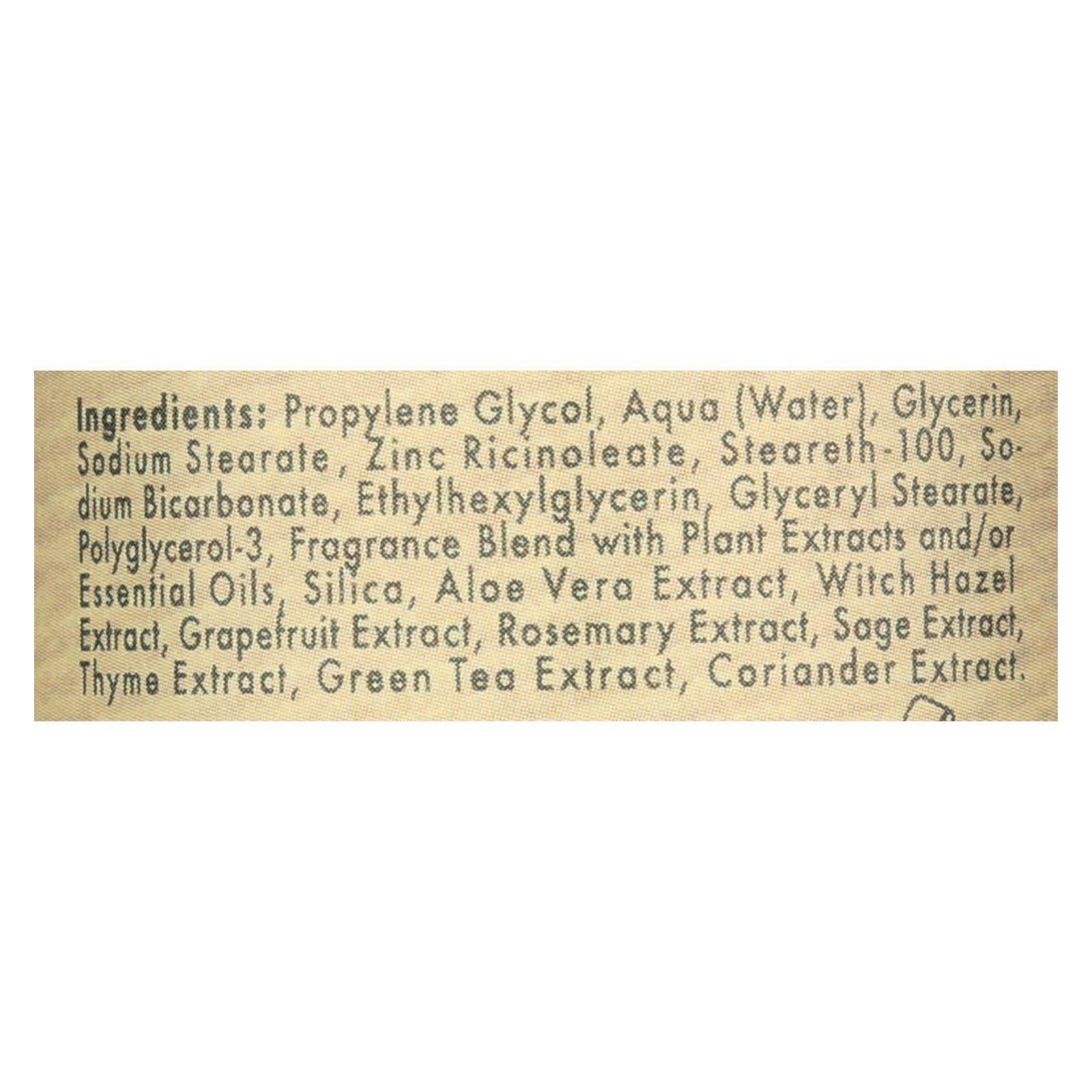 - Ingredients: PROPYLENE GLYCOL;AQUA;WATER;GLYCERIN;SODIUM STEARATE;ZINC RICINOLEATE;STEARETH-100;SODIUM BICARBONATE;ETHYLHEXYLGLYCERIN;GLYCERYL STEARATE;POLYGLYCEROL-3;FRAGRANCE BLEND WITH PLANT EXTRACTS AND/OR ESSENTIAL OILS;SILICA;ALOE VERA EXTRACT;HAZEL EXTRACT;GRAPEFRUIT EXTRACT;ROSEMARY EXTRACT;SAGE EXTRACT;THYME EXTRACT;GREEN TEA EXTRACT;CORIANDER EXTRACT