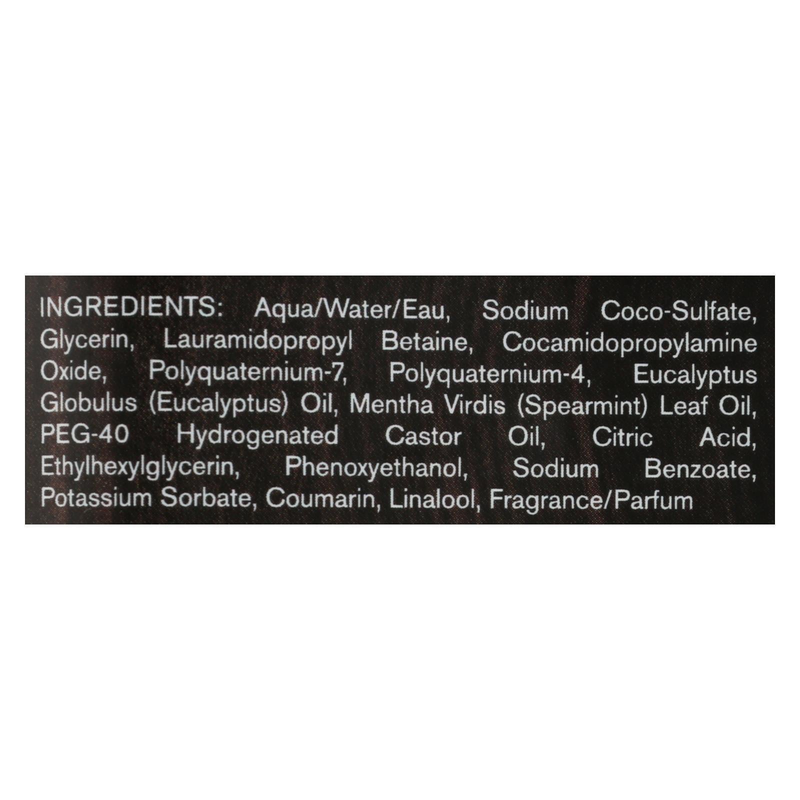 - Ingredients: AQUA/WATER/EAU;SODIUM;COCO-SULFATE;GLYCERIN;LAURAMIDOPROPYL BETAINE;COCAMIDOPROPYLAMINE OXIDE;POLYQUATERNIUM-7;POLYQUATERNIUM-4;EUCALYPTUS GLOBULUS;EUCALYPTUS;OIL;MENTHA VIRDIS;SPEARMINT;LEAF OIL;PEG-40 HYDROGENATED CASTOR OIL;CITRIC ACID;ETHYLHEXYLGLYCERIN;PHENOXYETHANOL;SODIUM BENZOATE;POTASSIUM SORBATE;COUMARIN;LINALOOL;FRAGRANCE/PARFUM